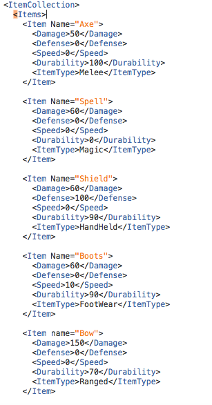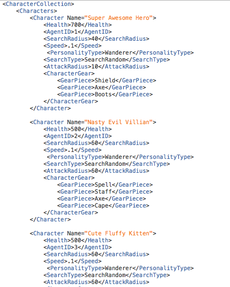 This XML holds a collection of Characters. These could be even further sorted if they are bipedal humanoids or quadruped animals. For right now though, we create all of our characters defining the values with whatever we want. So the “Characters” contains many child “Character” that have stats such as Damage, Defense, Speed, etc. These will all be parsed into a string that our code can read, creating characters