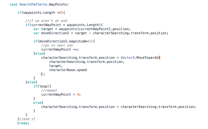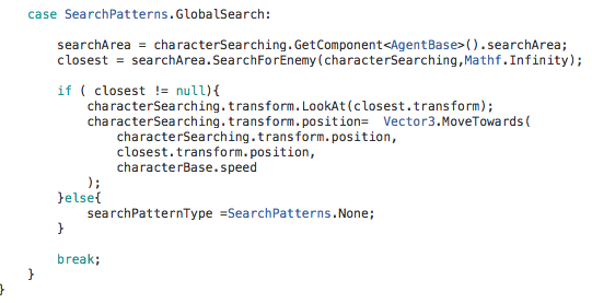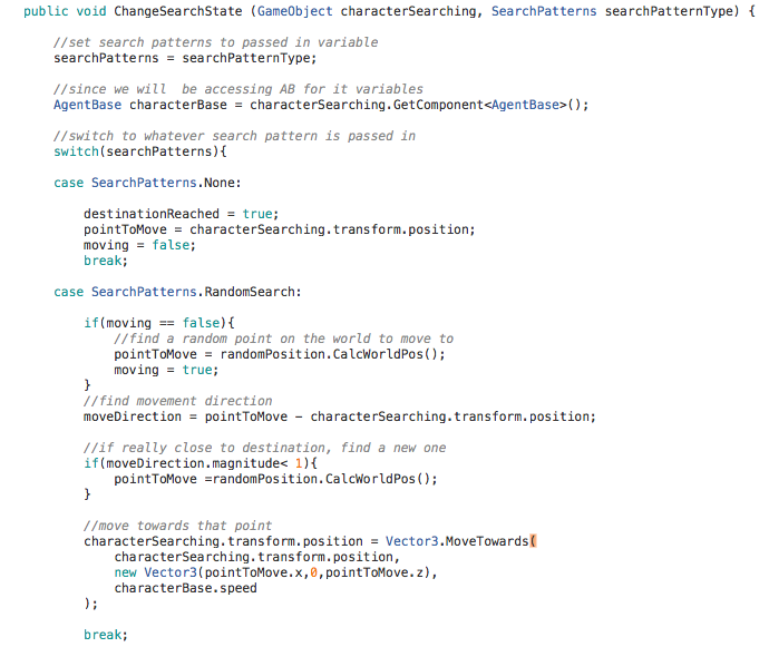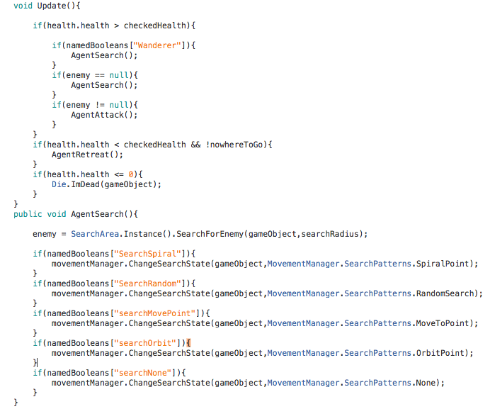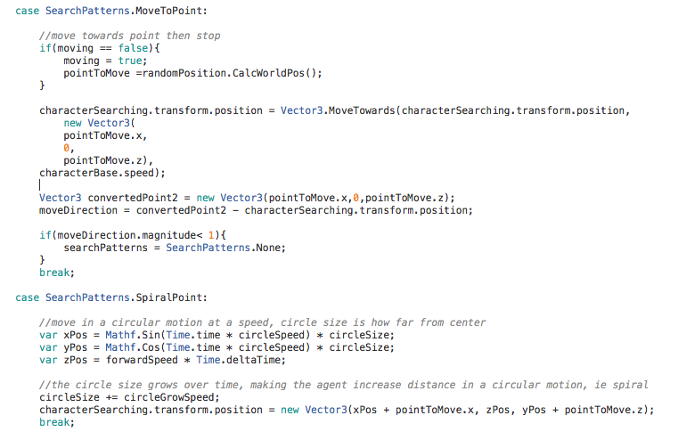MovementManager is made up mainly of a state machine that takes in the game object. It calls it so it can move and calculate movement by using types of search patterns. This script allows us to search by doing nothing, randomly picking points in sequence, move to a single point and stop, orbit a point, spiral a point, follow waypoints, or just ignore all searching an auto find nearest agent and move towards it.