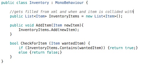 Inventory just has a list of items that are set up in the XML. Since this script is a mono-behavior and the inventory variable is public and since we made the item class serializable from before we can see all the items the agent has in the inspector which is really useful for debugging and designing*. We also have basic functions for adding and checking items. There could easily be more functions like drop item or destroy item.