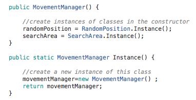 The MovementManager script creates an instance of itself when its Instance function is called which our Character Base does. This allows all of these functions to be easily accessible. In its constructor, MovementManager gets a reference to two other scripts that handle specific functionality that are not MonoBehaviours.