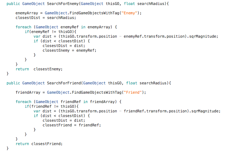 The point of this script is to handle movement related tasks. Searching is separated into its own script that can search for a friend or enemy. This can easily be expanded to search for groups, home bases, landmarks, etc.