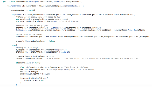 Character base first gets references to every script it will need. There are many ways to do this. I just did not want to have a manager game object with a ton of scripts on it, so I just have the manager scripts non-monobehaviours and instance them. If I only need one instance of that script, I could use a singleton pattern which is useful for global constants. Now, all of the Booleans are loaded into our dictionary. These could be split up into their own dictionary for the sake of organization. The bools right now handle movement and attack strategies that are set in the XML, activated when parsed, and can be toggled during run-time to change behaviors. This class could also be derived to create custom behavior for different types of characters. In Update, we make sure that if their health is above a threshold then the character moves and attacks. If it is below the threshold, then it retreats. Wander allows the character to attack and follows its search pattern at the same time; where other personality type like aggression cause the agent to stop its search pattern once an enemy is found and focus on it until dead. When the character runs out of health it is dead. Lets look more at each script making up our agent. Health and Die are very simple. Health just has a number that goes up and down and could control the rate at which that happens for something like recharging health or invincibility. Die destroys the game object and could reset game values and clean up. It is up to the agent base to decide what to do when health is at zero, not the health script, since dying could result in resurrection, being removed from the game world, etc. Each agent will have a simple Inventory for now like the code below.