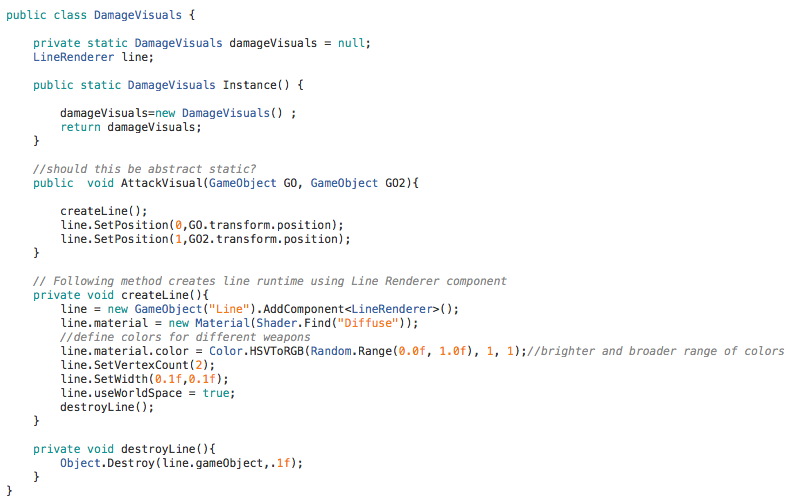 To complete the prototype, lets focus a little on visuals and spruce things up a bit since cubes are not all too interesting. We are going to visualize damage and health, separate from the damage and health calculation script. When an attack happens, we are going to show it by drawing a ray and changing its color. Each color could eventually mean certain types of weapons. Once combat involves more than just a distance check and starts having different types of projectiles, we could have the projectiles change health when they hit the agent base. As health goes down, lets also gradually change the color of the cube from green to red and add some color to our different items (spheres) so we can know what's what.