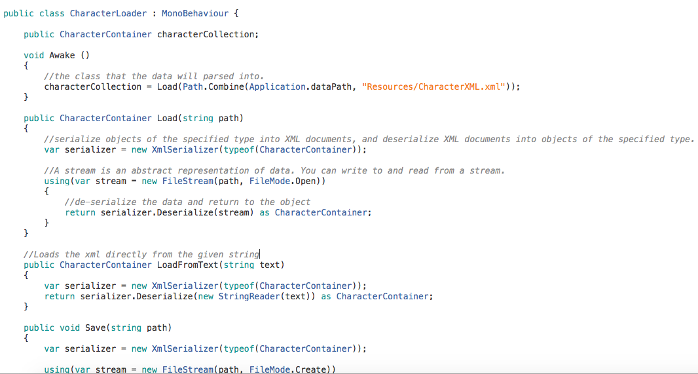 For the code above, The CharacterContainer holds the Characters array which will contain all of the Character nodes as defined with XML tags above.