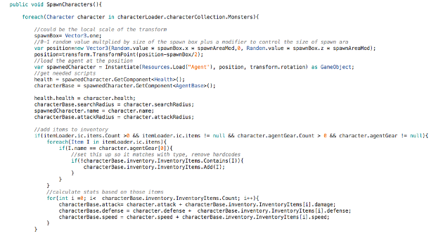 The Spawner iterates through our whole collection of characters that were parsed in through the XML. They are placed at a random position (this could be defined in XML also). The characters are made up of multiple scripts: a character base class, health, death, and inventory. All of these variables for those scripts are set here.