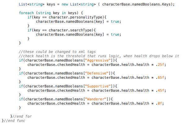 These strings are then called to switch the booleans on and off resulting in behavior unique to that character, such as search type and personality type (aggressive, defensive, etc). The Character Base Class is the core logic handler for our characters and is what brings life to our game.