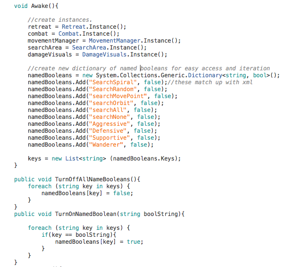Variables like search radius will be used by the base class for finding enemies; health will be filled into health variable on the agent base which is a reference to its health script. Then health will be evaluated, and so on for the other variables. If the agent is spawned with gear, that gear will be evaluated as well. In the agent base class, there is a dictionary containing many booleans that are defined with strings.